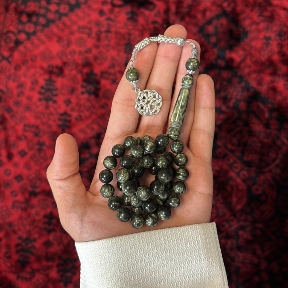 سبحة أنيقة مصنوعة من بكلايت عالي الجودة بلون أخضر داكن معرق بتفاصيل رخامية جذابة. تتميز حباتها بعمق اللون وتفاوت النقشة، مما يمنح كل حبة طابعاً فريداً ولمسة فاخرة. تصميم متوازن يجمع بين البساطة والرقي، لتكون خياراً مثالياً لمحبي السبح الهادئة والمميزة.